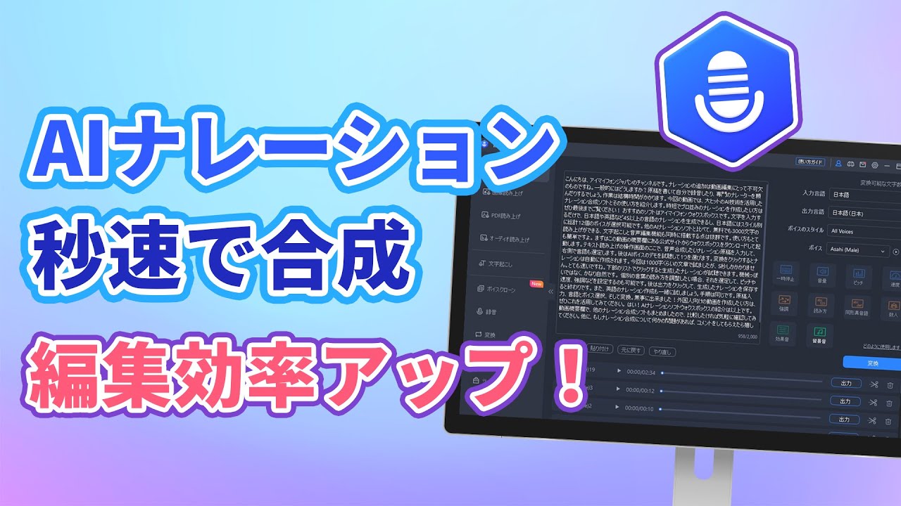 AIナレーション技術は、従来のナレーション制作の手間やコストを削減できることから、ビジネスやメディア業界で注目されています。ただし、動画制作などで導入したくても、多くのソフトがリリースしたのでどれを使ってよいのか困りますね。